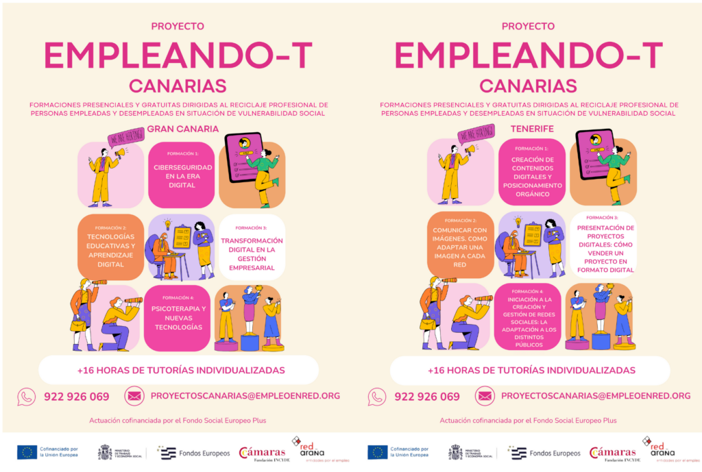 Empleando-T Canarias es un programa concedido por Fundación Incyde y cofinanciado por el Fondo Social Europeo Plus. Está dirigido a personas empleadas y desempleadas que quieran mejorar sus habilidades laborales e incrementar sus probabilidades de mejoría en sus respectivos trabajos o en la búsqueda de nuevas oportunidades. El objetivo general es ofrecer oportunidades de Reciclaje profesional (Up-skilling y Re-skilling). Para lograr este objetivo, las acciones que se realizarán serán las siguientes: -Formaciones grupales en las siguientes materias: ciberseguridad en la era digital (Gran Canaria), tecnologías educativas y aprendizaje digital (Gran Canaria), transformación digital en la gestión empresarial (Gran Canaria), psicoterapia y nuevas tecnologías (Gran Canaria), creación de contenidos digitales y posicionamiento orgánico (Tenerife), comunicar con imágenes. Como adaptar una imagen a cada red (Tenerife), presentación de proyectos digitales: cómo vender un proyecto en formato digital (Tenerife) e iniciación a la creación y gestión de redes sociales: la adaptación a los distintos públicos objetivos (Tenerife). -Tutorías individuales para la mejora de la empleabilidad del beneficiario/a que desea acceder al mercado laboral por cuenta ajena, o para la mejora en el propio empleo o la promoción a uno mejor. El proyecto se iniciará el 2 de diciembre de 2024 con su difusión para la captación y selección de participantes, seguido de la fase formativa, que incluye formación grupal y tutorías individuales. Este proyecto se desarrollará en Sta Cruz de Tenerife y Las Palmas de Gran Canaria.