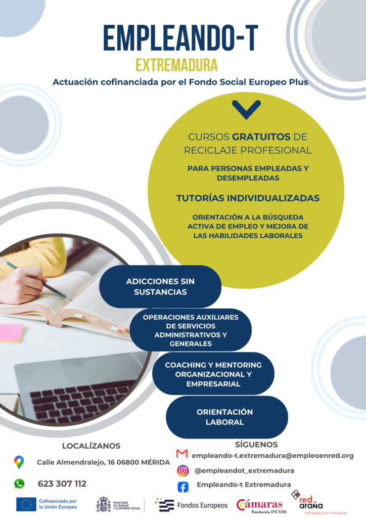 Empleando-T Extremadura es un programa concedido por Fundación Incyde y cofinanciado por el Fondo Social Europeo Plus. Está dirigido a personas empleadas y desempleadas que quieran mejorar sus habilidades laborales e incrementar sus probabilidades de mejoría en sus respectivos trabajos o en la búsqueda de nuevas oportunidades. El objetivo general es ofrecer oportunidades de Reciclaje profesional (Up-skilling y Re-skilling).