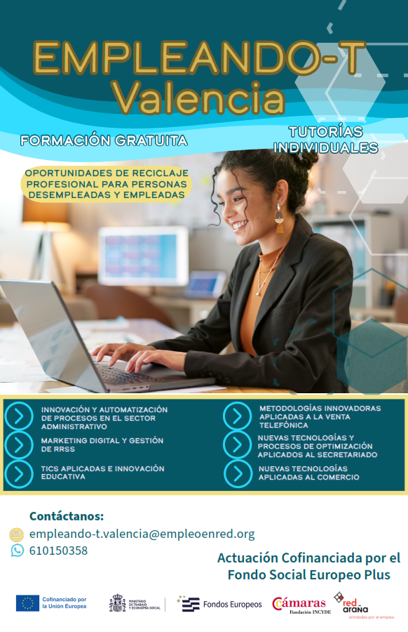 Empleando-T Valencia es un programa concedido por Fundación Incyde y cofinanciado por el Fondo Social Europeo Plus. Está dirigido a personas empleadas y desempleadas que quieran mejorar sus habilidades laborales e incrementar sus probabilidades de mejoría en sus respectivos trabajos o en la búsqueda de nuevas oportunidades. El objetivo general es ofrecer oportunidades de Reciclaje profesional (Up-skilling y Re-skilling). Para lograr este objetivo, las acciones que se realizarán serán las siguientes: -Formaciones en las siguientes materias: marketing digital y gestión de RRSS; innovación y automatización de procesos en el sector administrativo; TIC´S aplicadas e innovación educativa; metodologías innovadoras aplicadas a la venta telefónica; nuevas tecnologías y procesos de optimización aplicados al secretariado y nuevas tecnologías aplicadas al comercio. -Tutorías individuales para la mejora de la empleabilidad del beneficiario/a que desea acceder al mercado laboral por cuenta ajena, o para la mejora en el propio empleo o la promoción a uno mejor. El proyecto se iniciará el día 2 de diciembre de 2024 con su difusión para la una captación de participantes, y constará de selección y fase formativa, que incluye formación grupal y tutorías individuales. Este proyecto se desarrollará en la Comunitat Valenciana.