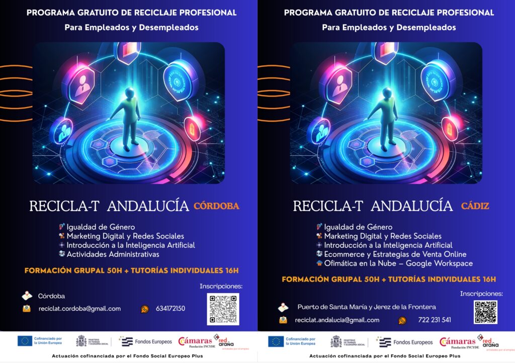 RECICLA-T Andalucía es un programa de Red Araña concedido por Fundación Incyde y cofinanciado por el Fondo Social Europeo Plus. Está dirigido a personas empleadas y desempleadas que quieran mejorar sus habilidades laborales e incrementar sus probabilidades de mejoría en sus respectivos trabajos o en la búsqueda de nuevas oportunidades. El objetivo general es ofrecer oportunidades de Reciclaje profesional (Up-skilling y Re-skilling). Para lograr este objetivo, las acciones que se realizarán serán las siguientes: