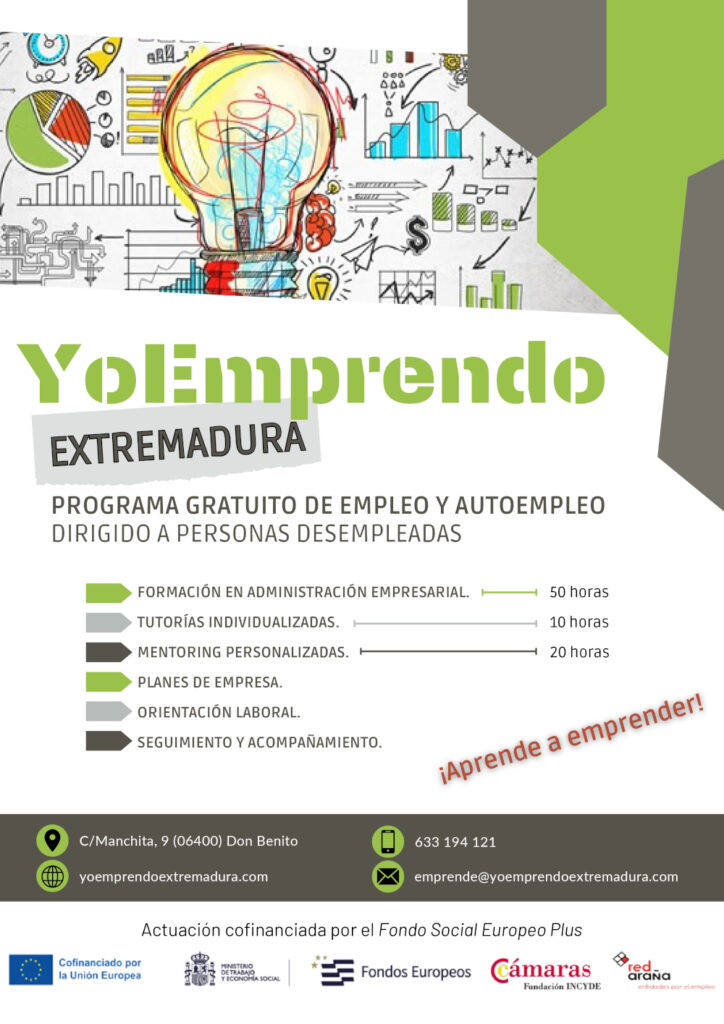 El programa YoEmprendo Extremadura se desarrolla gracias a la subvención de la Fundación Incyde y a la cofinanciación del Fondo Social Europeo Plus. Este programa se destina a mejorar la empleabilidad de personas desempleadas que se encuentran en riesgo de exclusión social. Se desarrolla en la provincia de Badajoz. Se dará prioridad en el acceso al proyecto a menores de 30 años, mujeres, mayores de 45 años y personas con discapacidad.